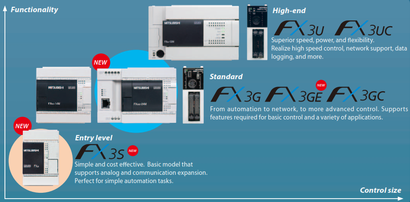 | Típus | FX3S | FX3G | FX3GE | FX3GC | FX3U | FX3UC |